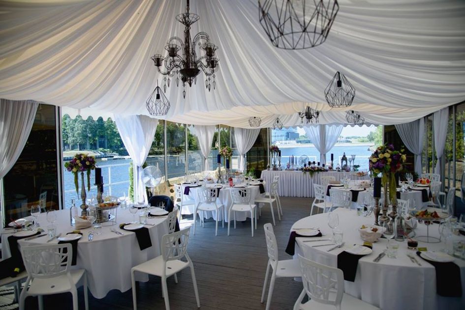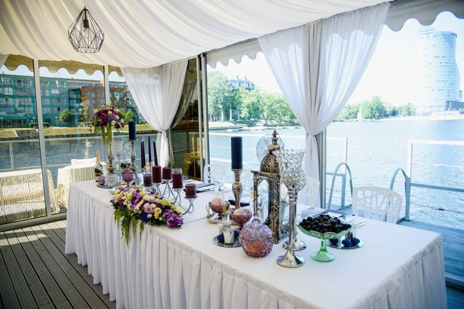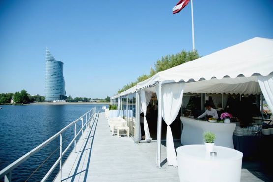 Svinību organizēšana visu veida pasākumiem – no slēgta vakara līdz pat lielai ballei. Piedāvājam organizēt īpašos notikumus kā jubilejas, Ziemassvētku balles, atklāšanas svētkus un prezentācijas, kā arī tik pierastas lietas kā konferences un klientu tikšanās uz peldošas platformas Daugavas krastā. Plašā un gaišā uz peldoša pontona izvietotā zāle ir ideāli piemērota arī tādām svinībām kā, kāzām, dzimšanas dienām, korporatīvajiem pasākumiem, semināriem u.c. Telpa ir aprīkota ar bīdāmām stikla sienām pontona izmēri 35x10m (350m²) nojume 150 m² un 200 m² atklātā terase Telpas pagrabstāvā 200 m² (tualetes, ģērbtuves, noliktava, virtuves telpas) Unikāla iespēja pietauvoties ar kuģiem, laivām vai citiem peldlīdzekļiem, kā arī pietauvot pašu peldošo platformu izvēlētā pasākuma vietā. Cena pēc vienošanās. Pontona ietilpība Sēdvietas 120 personām Furšets 200 personām TELPU NOMAS MAKSĀ IETILPST: zāles iekārtojuma nodrošināšana 120 personām apaļie galdi krēsli ar pārvalkiem apgaismošana interneta pieslēgums pēc pieprasījuma augstākas klases apkalpošanas nodrošināšana PAPILDUS PIEDĀVĀJAM: pilnu ēdināšanas servisu (kafijas pauzes, pusdienas, zviedru galds, vakariņas) muzikālo noformējumu un koncertprogrammas, ziedu kompozīcijas un florista pakalpojumus, sarīkojuma apsardzi, pietauvot pontonu Jūsu izvēlēta vietā dažādas citas lietas Jūsu sarīkojuma veiksmīgai norisei.